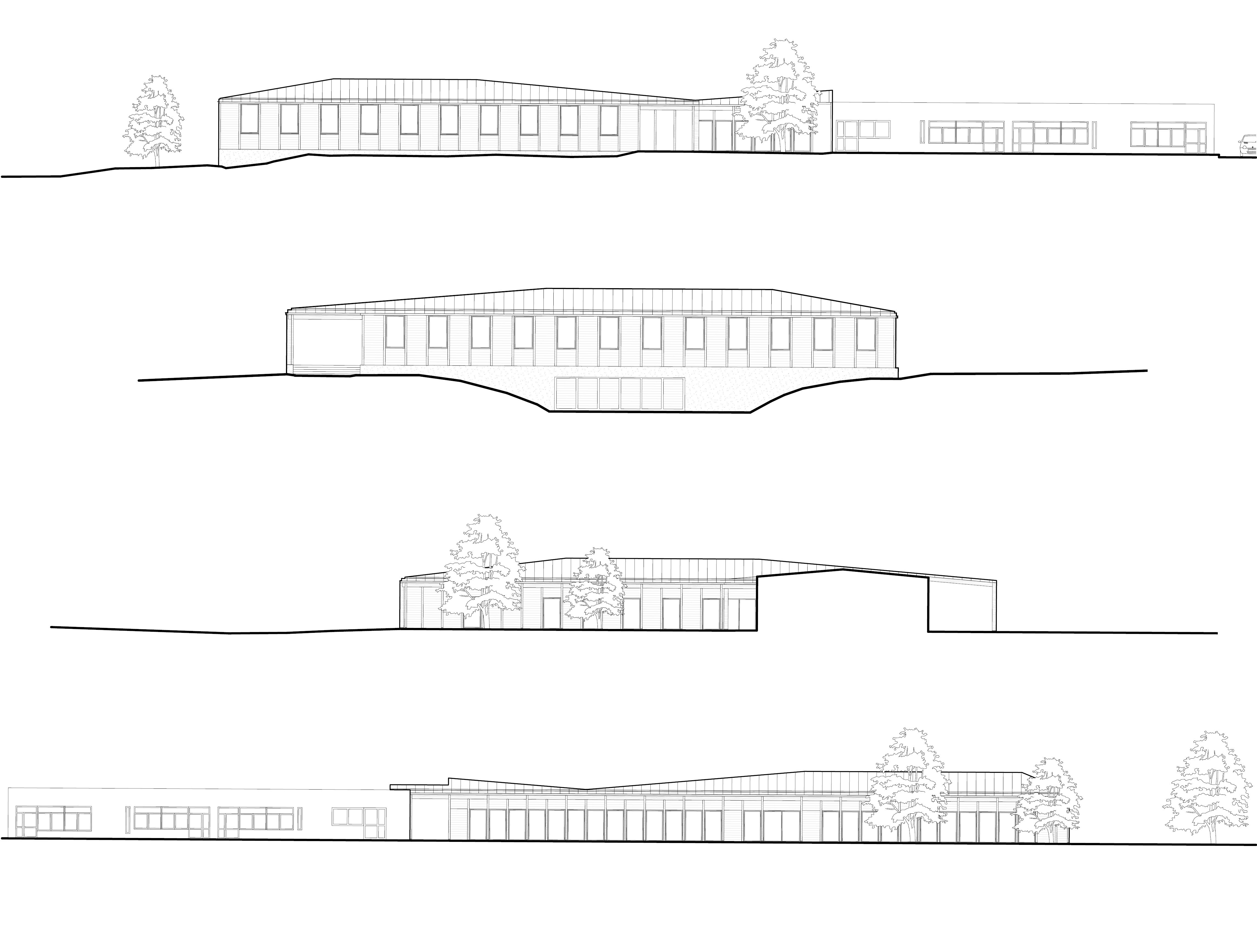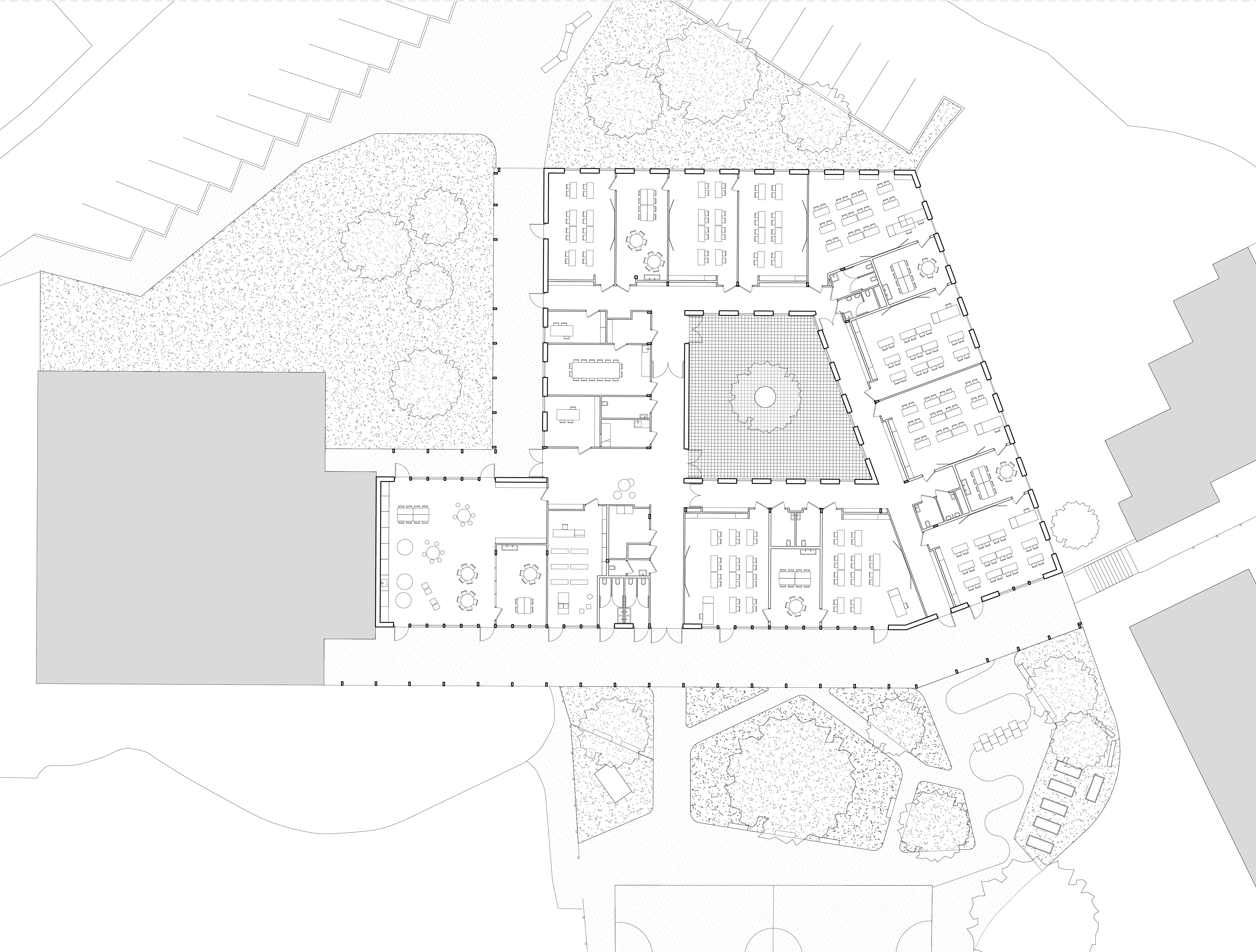 La volumétrie générale du projet est le fruit d’une réflexion prenant en compte des enjeux contextuels et fonctionnels. Proche à la fois d’habitats pavillonnaires, mais aussi d’équipements publics d’envergure, le projet doit s’intégrer dans un contexte éclectique. Le projet d’école adopte une figure élégante, tramée par sa façade bois et ses ouvertures et couronné par une toiture zinc en pente pour répondre au bâti environnant tout en présentant des matériaux dont la qualité exprime de fortes ambitions environnementales. Le plan s’articule comme une figure géométrique simple qui borde les limites et contraintes du site, percée en son centre et créant un patio. Les éléments de programme se composent ainsi de plain-pied sur les façades extérieures du bâtiment et sont regroupés autour d’une circulation qui tourne et distribue les espaces autour du patio permettant à chaque espace d’être éclairé naturellement.