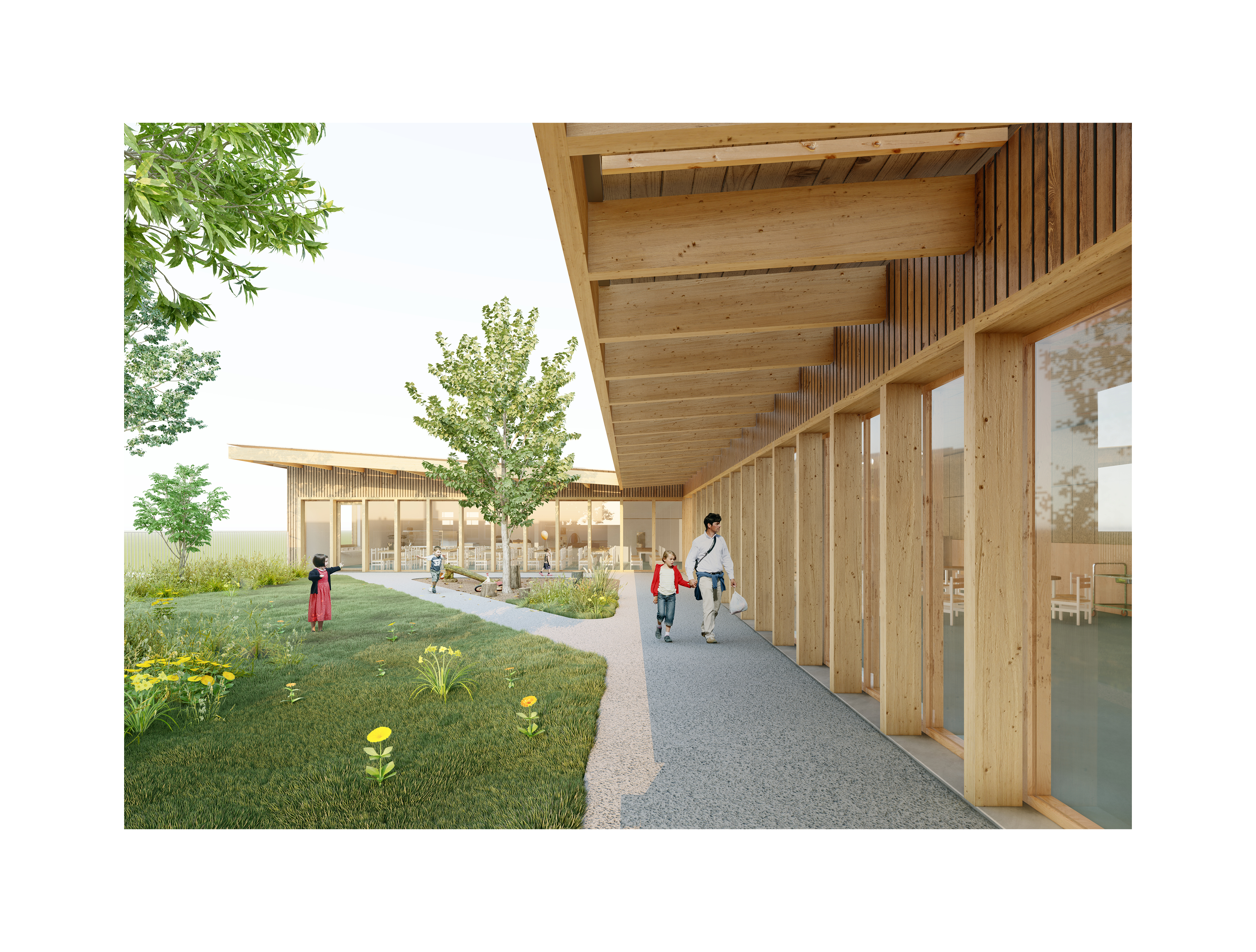 La parcelle se situe dans un contexte proche éclectique. Au sud, le site proposé est en vis-à-vis avec les pavillons voisins. Le choix d’une implantation en L apparaît donc comme évidente pour privilégier les vues au Nord tout en adoptant une volumétrie simple. La volumétrie architecturale adopte une posture fine et élégante. Le niveau bas du projet se dessine comme un socle en béton sablé lui donnant une texture granulée proche de la pierre. Sur ce socle, le niveau de Rez-de-chaussée se pose avec légèreté. Pensé en structure ossature bois avec un bardage comme revêtement extérieur, sa matérialité lui donnera un aspect chaleureux et permettra d’affirmer les ambitions environnementales du projet. Enfin, une toiture monopente en Zinc et construite en charpente bois créera des débords de toitures notamment le long des façades nord et ouest faisant office d’abris.